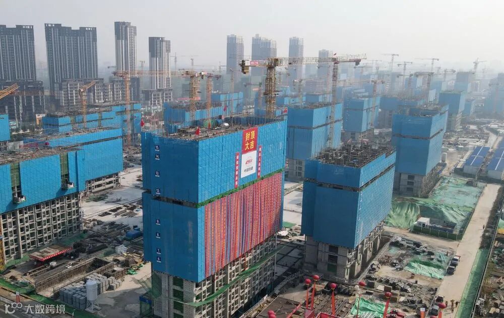 ↑9月28日,中铁二十局的工人在石家庄高新技术产业开发区集中安置区棚户区改造项目H区22号楼建设现场施工(无人机照片)。杨世尧 摄