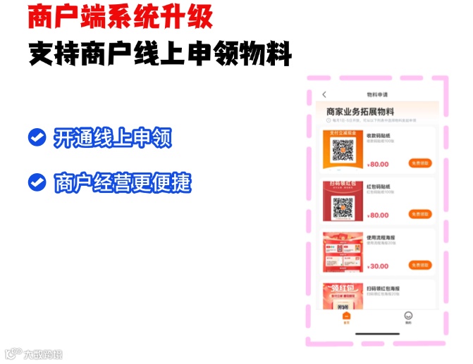 商户端系统支持线上申领物料,打破线下申领的繁琐壁垒: