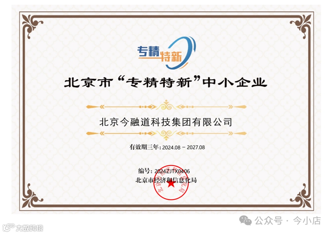 今融道集团凭借今小店SaaS产品及服务在中小实体商家数字化升级领域的关键性突破,再获“北京市专精特新”中小企业的认证,这标志着今融道集团在专业化、特色化、创新性以及技术专精方面受到了国家评选标准与行业的高度认可,该荣誉不仅彰显了今融道集团在行业内的领先地位,也为今融道集团未来的发展注入了新的动力。