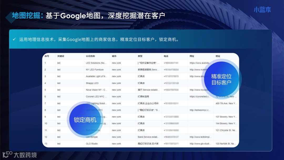 小蓝本外贸版的全球获客能力远不止于此。系统还能深度挖掘LinkedIn、Facebook、WhatsApp等主流社交平台数据,结合Google地图拓客技术,即便在实体展会停摆的情况下,也能让外贸人坐在办公室里,通过地理信息技术锁定全球各地的潜在商家,建立起一条条稳固的线上获客通道。这种多渠道、全方位的触达能力,让企业在物理隔绝的困境中依然能保持与全球市场的紧密连接。