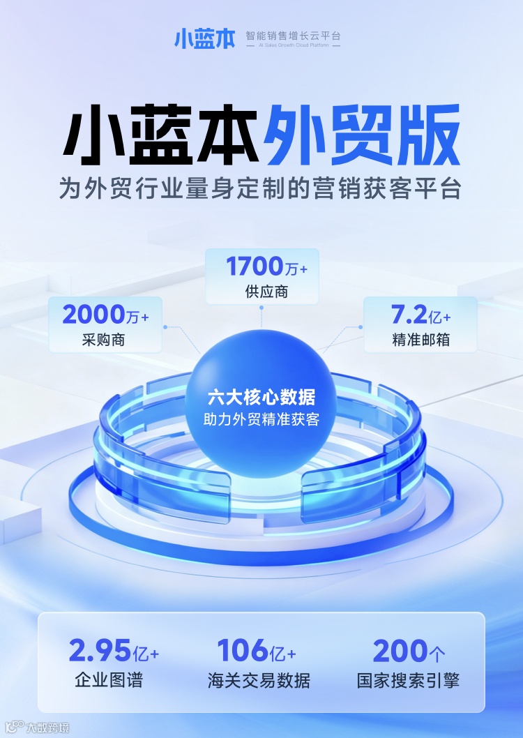 在数据为王的时代,谁能率先利用智能化手段掌握全局动态,谁就能在不确定性中锁定确定的增长。小蓝本外贸版愿做你穿透硝烟的眼睛,助你在全球200个国家的商机中,找到下一个避风港。无论世界如何变化,数据永远指引着贸易的方向。