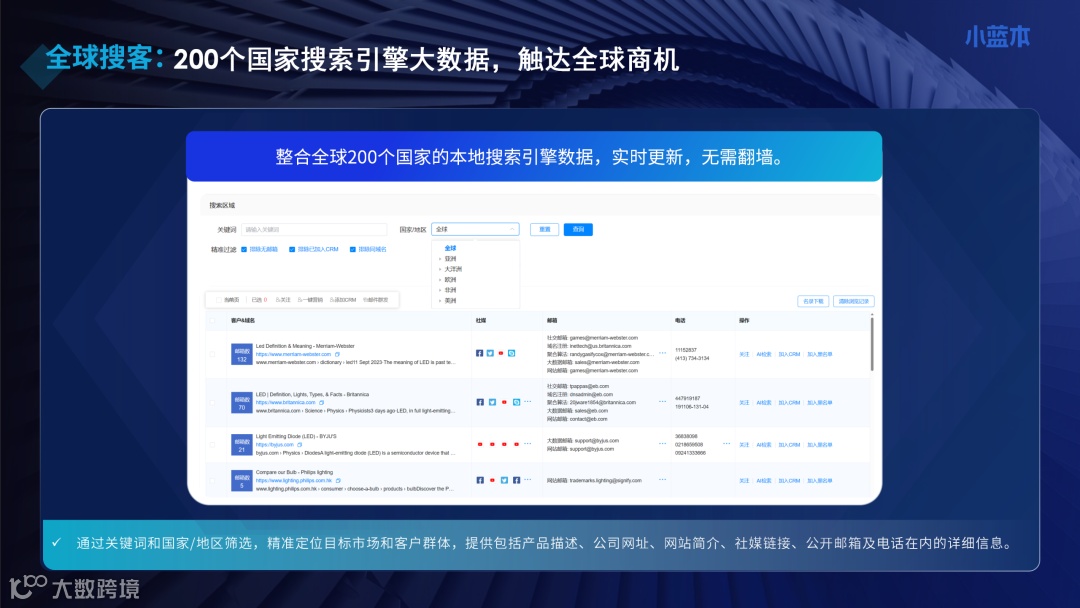 在客户联系层面,7.2亿+精准邮箱和全球200个国家搜索引擎大数据构成了小蓝本外贸版的核心优势。战火可能导致当地的网络中断,但无法摧毁海量的互联网数据基底。当客户的电话打不通时,邮件成为唯一温柔且高效的问候通道。