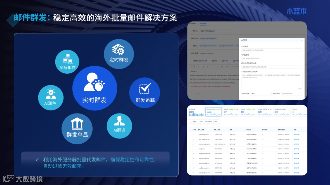 利用国家搜索引擎大数据,小蓝本外贸版整合了全球200个国家的本地搜索引擎数据,无需翻墙即可挖掘当地商机。针对特定市场,系统通过AI精准筛选出7.2亿+决策人的公开邮箱,并配备AI邮件助手支持多语言翻译、定时群发、单显发送等高级功能。即便物流停了,即便通讯中断了,商情不能断,你需要的是时刻准备着,在战后重建的第一时间与客户重新建立连接。