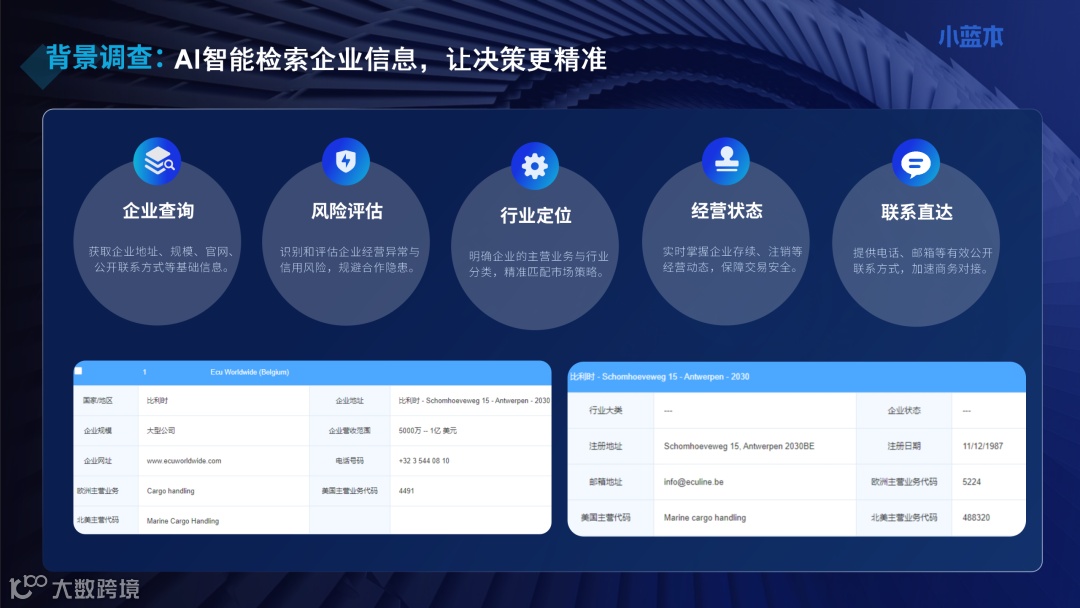 在风险控制与战略决策方面,小蓝本外贸版提供了从线索挖掘到客户背调的一站式服务。在与受制裁风险影响的地区进行交易时,背景调查功能成为了企业的“安全阀”。系统可提供详尽的企业风险评估、经营状态监测及行业定位分析,帮助外贸人在接触新客户前就摸清对方的底细,有效规避合规雷区。