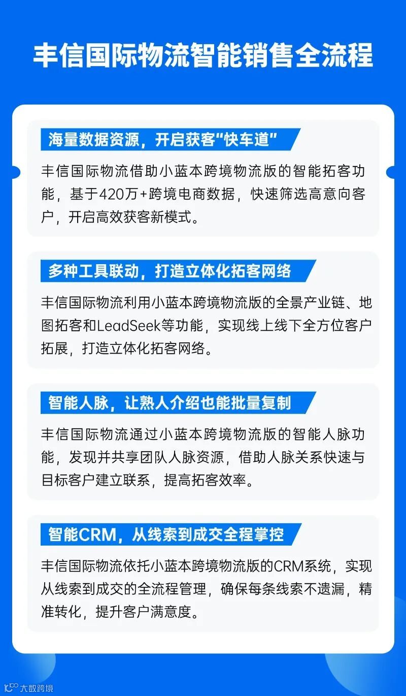 未来,丰信国际物流将继续深耕国际物流行业,为跨境电商客户提供更高效、更稳定的物流服务;而小蓝本跨境物流版,也将持续赋能更多国际物流企业,用AI+大数据重塑国际物流的获客模式,让每一家国际物流企业都能精准触达全球商机。