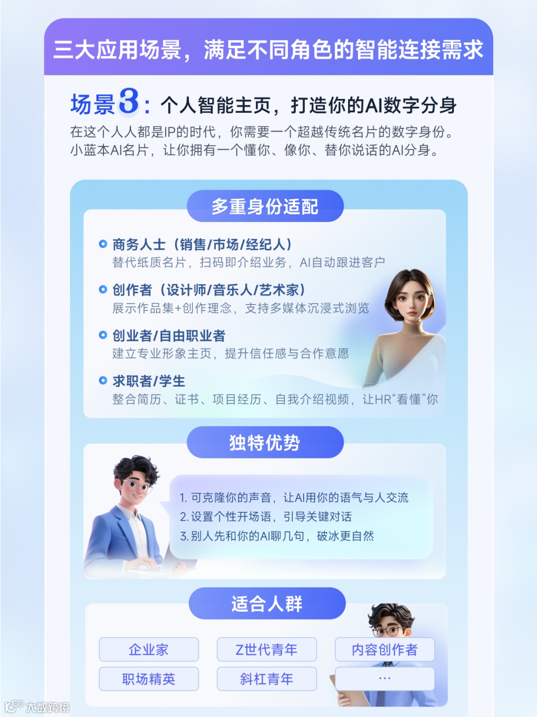 对个体用户而言,AI名片是数字时代的“数字分身”。无论是企业家、自由职业者,还是Z世代青年、斜杠创作者,都能借此建立专业、鲜活的线上形象。别人不再只是收到一个电话号码,而是开启一段由AI引导的深度对话——破冰更自然,合作更可期。