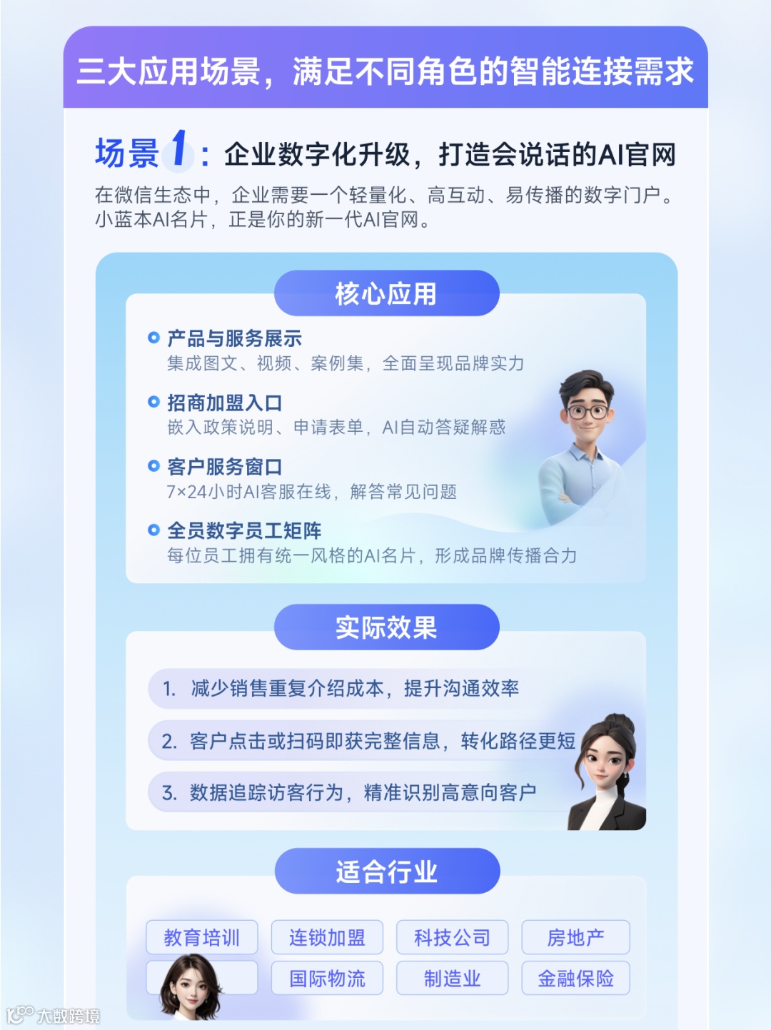 小蓝本AI名片并非仅限于个人使用,其设计初衷即面向多元角色与复杂场景。对企业而言,它是轻量级的“AI官网”:在微信生态中,无需开发成本,即可实现产品展示、招商加盟、客户服务等功能,并支持全员部署统一风格的AI名片矩阵,形成品牌传播合力。尤其适用于教育培训、连锁加盟、科技公司、外贸物流等高频沟通行业,显著降低销售重复劳动,缩短客户转化路径。