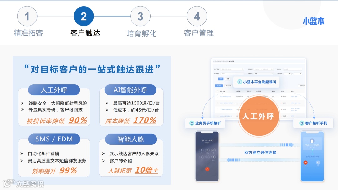 如果你是整个公司级别的使用,收集了大量关键人的公开联系方式之后,你还可以用小蓝本AI外呼工具去打电话,快速地筛选出有意向的客户。