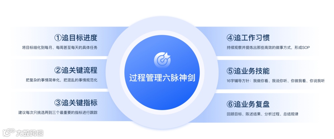 一旦目标设定完毕,过程管理就成了确保这些目标得以实现的关键。目标定得再好,不追过程,就很难拿到想要的结果。一个成功的销售管理者不会等到项目结束才去评估结果,而是会密切关注每一个执行步骤,及时调整策略以应对可能出现的问题。追过程还是提高组织能力和团队执行力的关键。过程管理分为六步: