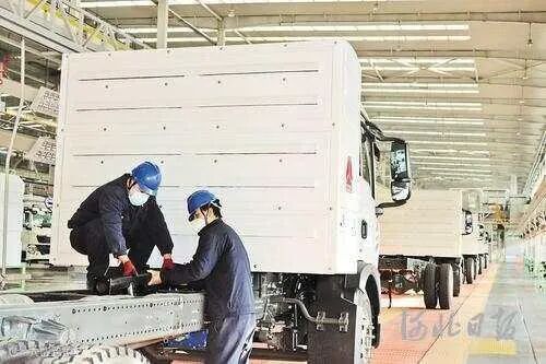 近日,冀中装备石煤机公司环卫车生产车间,工人们在组装纯电动四季多功能扫路车。河北日报记者史晟全摄