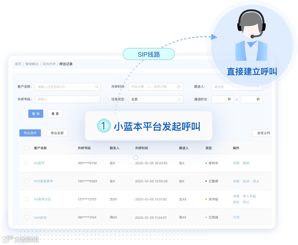 解决方案二:目前河狸家正在开拓抖音本地推广商家运营业务,需要联系海量客户,开拓业务,那么有没有低成本、高效方式去触达这部分用户呢?这里就用到了小蓝本人工外呼系统(巡航外呼系统/小号双呼系统):平台通过连接到SIP线路,实现呼叫的建立和通话的传输,具有稳定性高、音质好、成本低等优势,恰好可以满足河狸家现阶段业务大量呼叫的需求,有效提升外呼成功率和工作效率。
