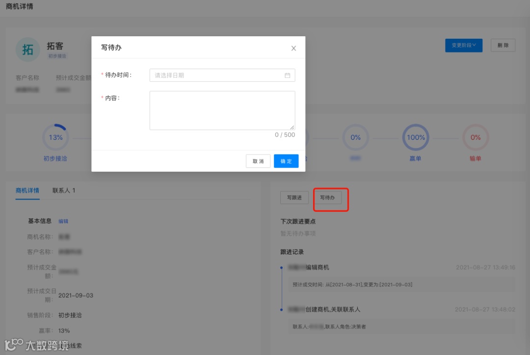 在商机详情页,点击【写待办】,在弹窗中填写待办内容、待办时间即可。