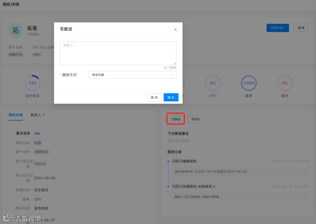 在商机详情页,点击【写跟进】,在弹窗中填写跟进内容、跟进方式。即可创建一条跟进记录。