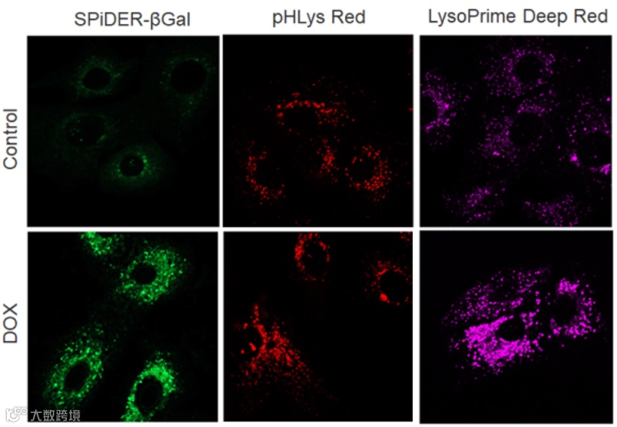 用Doxorubicin(DOX)刺激A549细胞诱导细胞衰老后,检测细胞内衰老相关β-半乳糖苷酶(SA-β-Gal)和溶酶体量与pH的变化。用检测细胞衰老,分别用LysoPrime Deep Red和pHLys Red(货号:L265)检测溶酶体的量和pH的变化。荧光显微镜的观察结果发现伴随着细胞衰老的发生,三个检测指标均有上升。另外,通过酶标仪的数值化的检测,也得到了相同的检测结果。