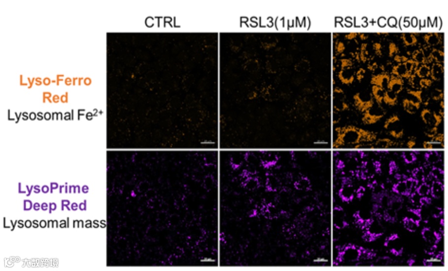RSL-3诱导铁死亡时,溶酶体Fe(II)增加和溶酶体肥大化同时发生,提示溶酶体铁在铁死亡中的关键作用。