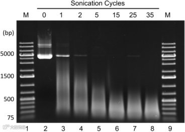 染色质片段化的超声条件因细胞类型以及超声仪功率和探头直径的差异化而不同,超/停时间间隔和循环次数都是片段化的核心因素。应优化程序:不同功率超声30s、停30s,分别进行5次/10次/20次/30次等超声并检测染色质片段化程度。