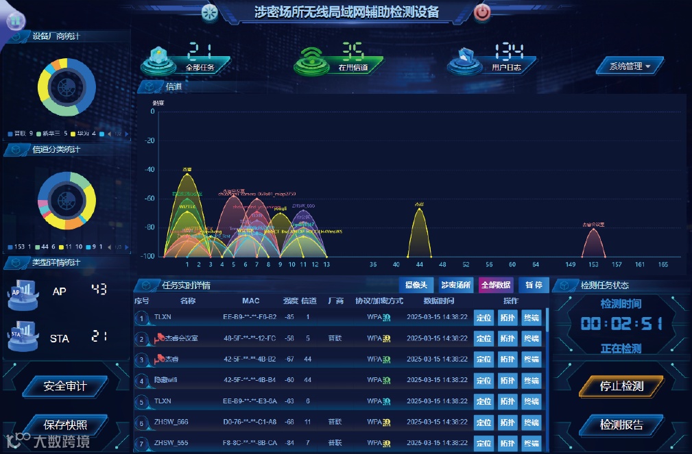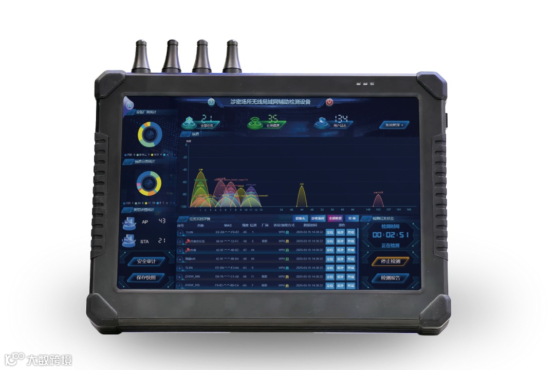 涉密场所无线局域网辅助检测装备独立运行检测,不接入目标网络,采用无线局域网信号嗅探,协议解析,对目标信息系统的无线热点以及终端进行检测和定位,辅助检测人员评估目标信息系统的安全隐患。