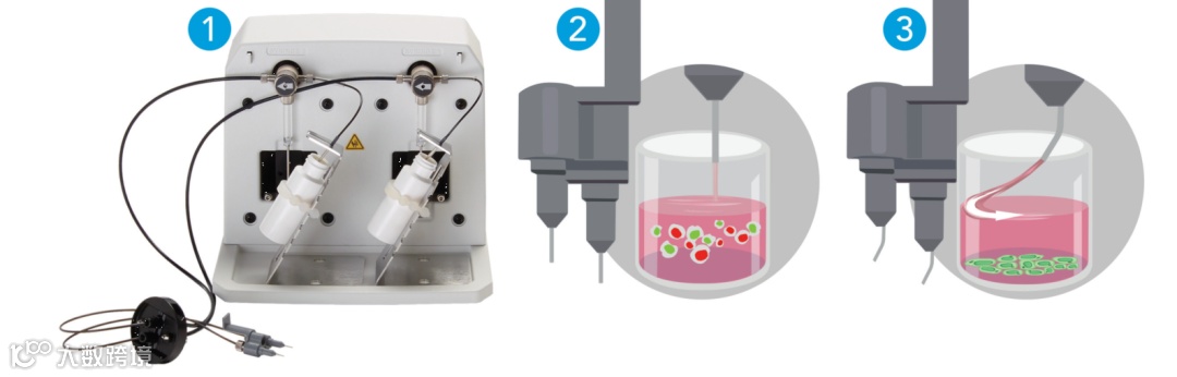 Synergy H1配备的可靠精密的双自动加样器( 图①)提供两种类型的加样头: ② 为直角型加样头,可实现剧烈混合,用于快速加样/检测;③ 为带角度加样头,不会干扰细胞层,适用于细胞等钙流动力学等应用。