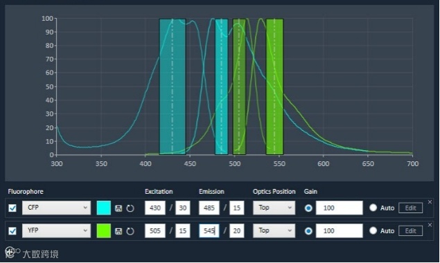 FRET 实验: CFP 和 YFP 的激发和发射波长和带宽设置