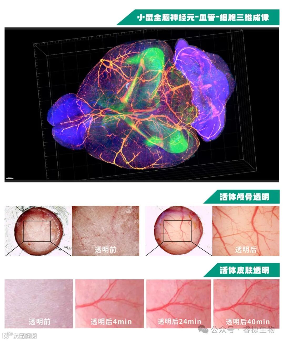 2)活体透明技术——安全无创透明活的动物或人皮肤及骨头,可提高活体动物成像深度和分辨率;