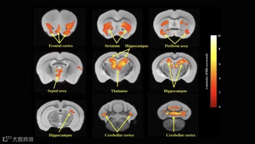 图4 小鼠脑部功能核磁VBM分析图