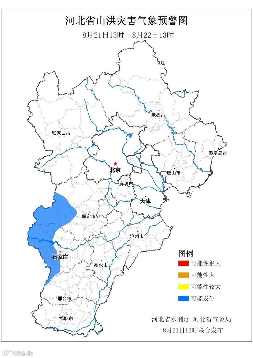 石家庄市水利局、石家庄市气象局和石家庄市应急管理局8月21日13时联合发布山洪灾害气象预警:预计8月21日13时至8月22日13时,石家庄市鹿泉区、矿区、行唐县、灵寿县、平山县、井陉县、元氏县、赞皇县等局地可能发生山洪灾害(Ⅳ级,蓝色预警)。请上述地区注意做好实时监测、防汛预警和转移避险等防范工作。