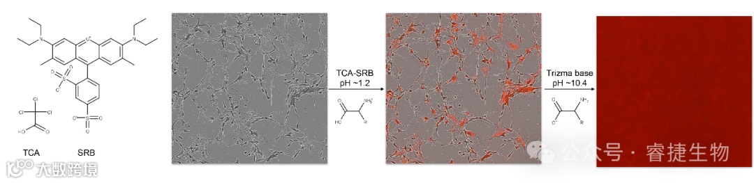 微孔板样品通过冷 TCA-SRB 同时固定和染色。在酸性条件下,SRB 与碱性氨基酸残基结合。经过洗涤步骤后,SRB 在碱性条件下溶解并释放到上清中,通过SRB信号可以反映了每个孔中细胞蛋白含量。
