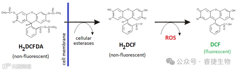 细胞渗透性 2',7'-二氯二氢荧光素二乙酸酯(H2DCFDA)本身没有荧光,可以自由穿过细胞膜,进入细胞内后,可以被细胞内的酯酶水解生成H2DCF。而H2DCF不能通透细胞膜,从而使探针很容易被装载到细胞内。细胞内的活性氧可以氧化无荧光的H2DCF生成有荧光的DCF (Ex/Em=488/525 nm)。