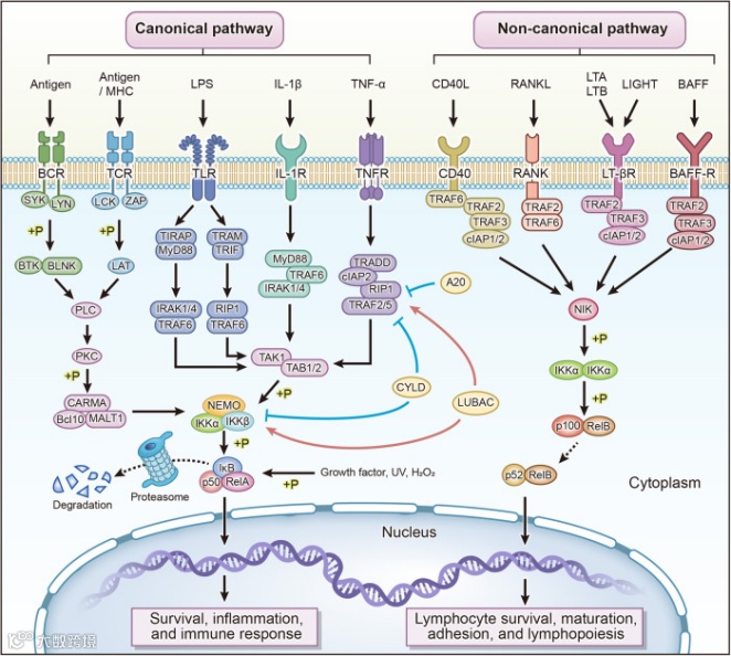 IMD-0354(AbMole,M2769)是一种小分子IKKβ抑制剂,通过选择性阻断IKKβ活性,有效抑制经典NF-κB信号通路的激活[22]。IMD-0354(IKK2 Inhibitor V)的应用广泛,覆盖炎症、肿瘤及代谢研究。在细胞模型中,IMD-0354能有效抑制多种肿瘤细胞(如肺癌细胞、黑色素瘤细胞)的增殖,并通过阻断NF-κB依赖的MET激活,增强细胞对凋亡的敏感性[23]。IMD-0354还在小鼠过敏性炎症模型表现出抗过敏和抗炎效果,其核心机制同样依赖于对NF-κB通路的抑制[24]。