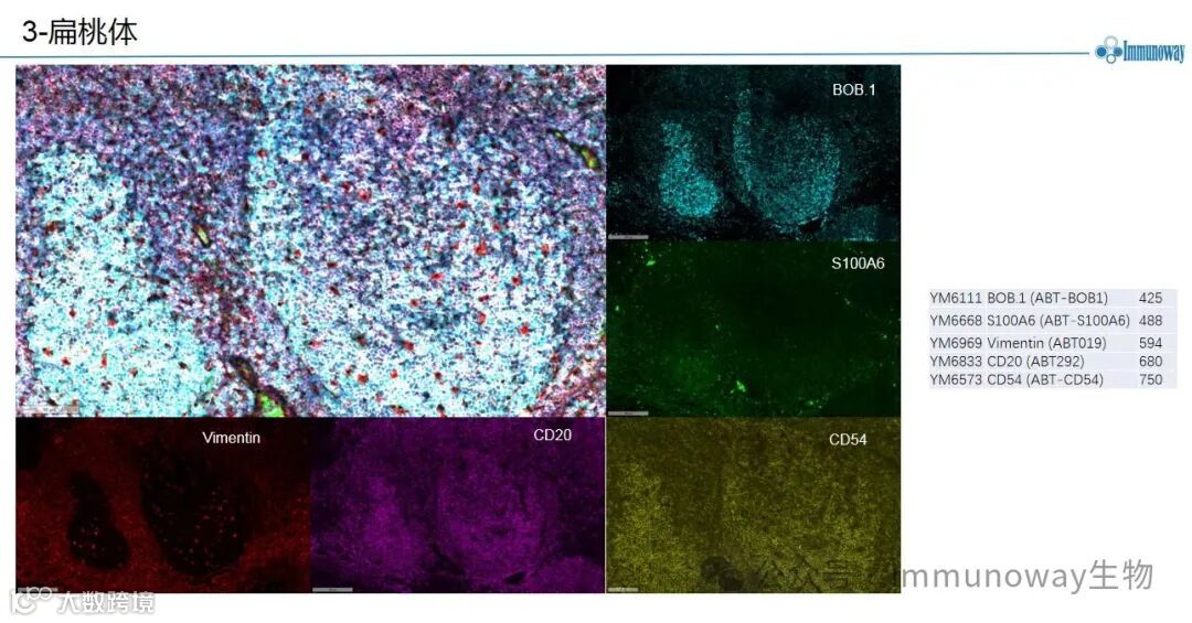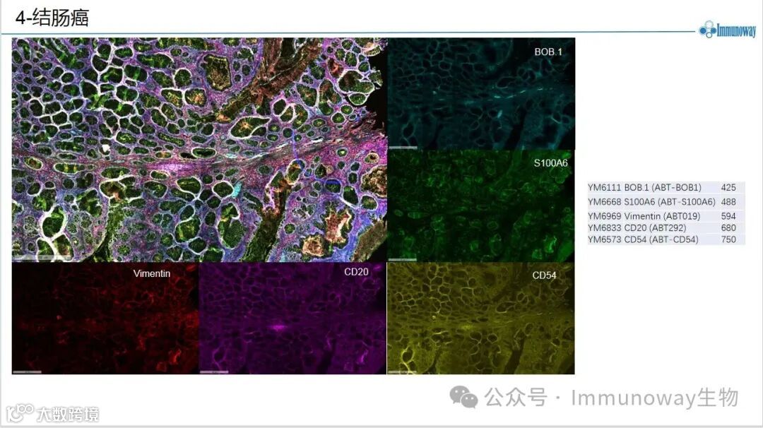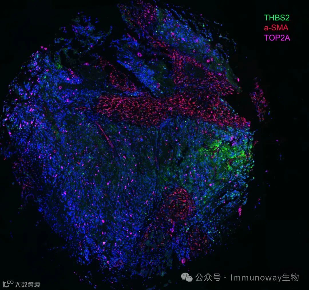 Immunoway推出的多重荧光免疫组织/细胞化学检测试剂盒,满足从双标三色-六标七色的检测需求。实现了如原位展示,定量分析;空间关系展示,区分细胞亚群;靶点和微环境同时分析;多靶点自由组合,不受一抗种属来源限制。