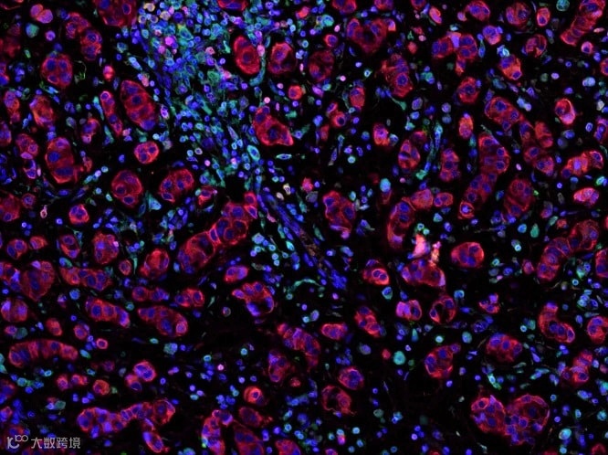 人乳腺癌组织,染色在Leica Biosystems BOND® MAX仪器上完成,使用Opal™ 6-Plex Detection Kit (NEL821001KT, Akoya Biosciences®),图像扫描在Vectra 3 Imaging System (Akoya Biosciences®)上完成。该数据和图片由ImmunoAtlas惠赠。
