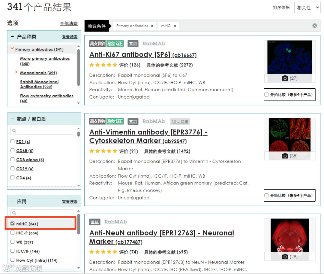 选用高特异性、高灵敏度、批间高一致性的一抗是TSA循环染色实验成功的第一步。相较于多抗,一般优先选择特异性更好的单抗,而Abcam 重组抗体具有高特异性、高灵敏度、高批间一致性的优势,是TSA循环染色实验的理想选择。另一方面,可以优先选择经过TSA循环染色验证的抗体克隆,Abcam 已开发了超过50个 Opal™ TSA mIHC panel,经验证的重组抗体货号数目达到340个,可以在Abcam官网应用一栏勾选mIHC即可查看经TSA mIHC验证的一抗,见图1红框。