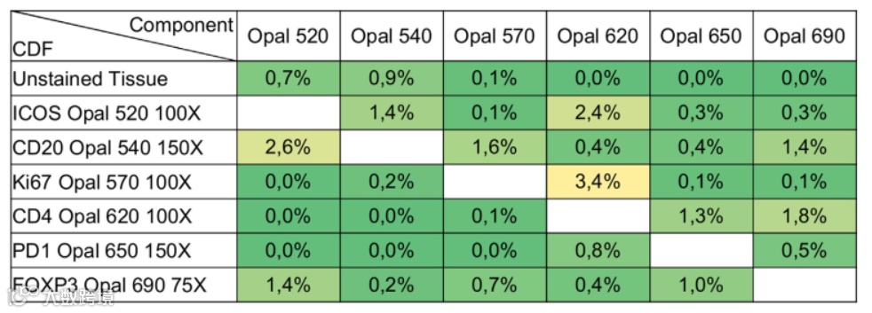 对于panel设计信号串色情况的评估,可对各通道TSA单染但经历mIHC所有抗体去除步骤循环,以模拟实际的mIHC染色,并评估单染信号向其它通道串色的效应1,示例见图7。对于表型分型和表达水平评估,低于5% 信号串扰的panel设计是可被接受的1。