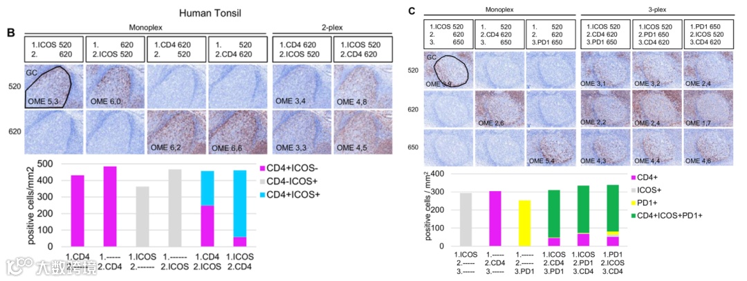 Boisson, A.等报道的工作是先确定共表达靶标染色顺序,即先测试2-plex染色不同顺序染色信号强度和阳性染色细胞密度,当2-plex染色信号强度与单染样本相当,且阳性染色细胞密度与单染样本相当的2-plex染色顺序即被确定。然后在这两个共表达靶标染色顺序确定的基础上,再测试多加一个共表达靶标的3-plex情况,同样地,当3-plex染色信号强度与单染样本相当,且阳性染色细胞密度与单染样本相当的3-plex染色顺序即被确定为后续测试的染色顺序1。