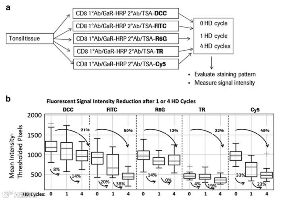 关于TSA荧光染料的稳定性数据,可以参考TSA荧光染料试剂盒生产商所展示的信息。或者通过设计实验来明确。如 Zhang, W.等报道的工作所设计,使用待检样本中确定表达的靶点的一抗及所对应的HRP偶联二抗,测试搭配不同TSA荧光染料在不经抗体去除步骤、经1轮、4轮抗体去除步骤后,检测TSA荧光染色的强度3,见图2。一般受抗体去除步骤影响最小的TSA荧光染料可安排在较前的轮次,而受抗体去除步骤影响最大的TSA荧光染料可安排在较后的轮次3。