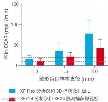 图 3. 圆形肝脏组织样本的基础 ECAR 测量。在安捷伦 Seahorse XFe24 分析仪上使用 Seahorse XF24 胰岛捕获微孔板采集的 ECAR 测量值低于该仪器建议的最小值 20 mpH/min(红色虚线)。在安捷伦 Seahorse XF Flex 分析仪上使用安捷伦 Seahorse XF Flex 3D 捕获微孔板-L 采集的 ECAR 测量值高于该仪器建议的最小值 10 mpH/min(蓝色虚线)。数据代表三次独立实验的平均值 ± SD