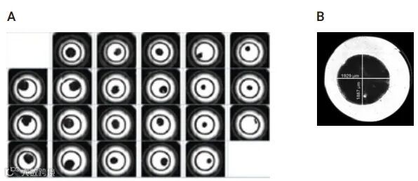 图 5. (A) 放置捕获环之前圆形肝脏组织样本的高对比度明场图像(4 倍放大倍率)。(B) 其中一个孔内样本的直径测量值
