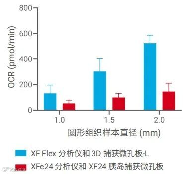 图 2. 圆形肝脏组织样本的基础 OCR 测量。在安捷伦 Seahorse XF Flex 分析仪上使用安捷伦 Seahorse XF Flex 3D 捕获微孔板-L 进行的 OCR 测量表明,随着圆形组织样本直径增加,信号显著提升。数据代表三次独立实验的平均值 ± SD