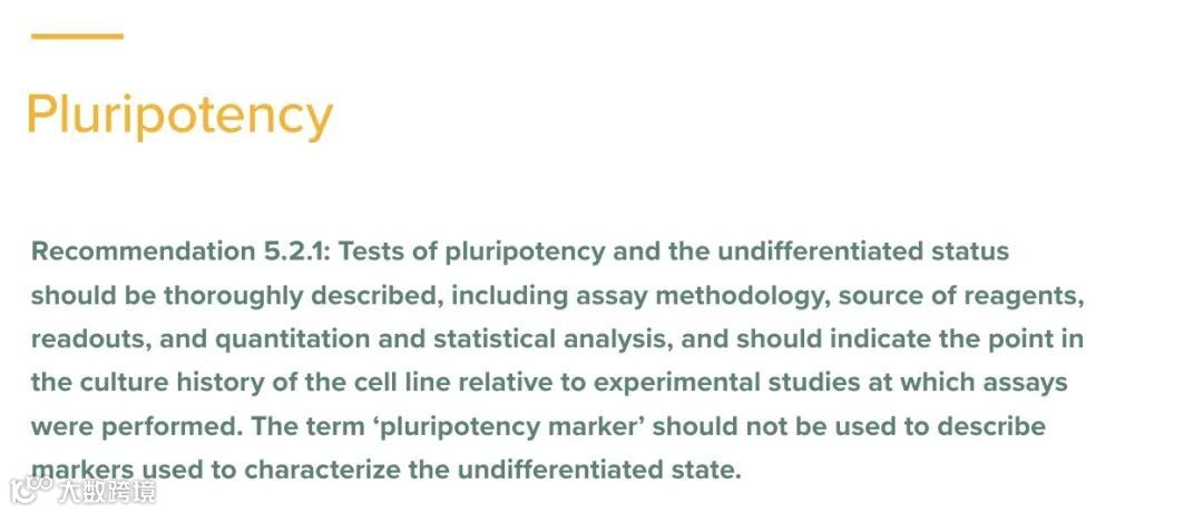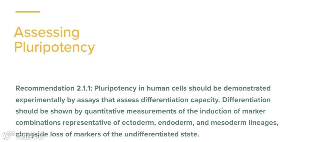 如指导原则中所述,多能性是一种功能特性,意味着单个细胞能够分化成生物体的所有体细胞类型。一个细胞系只有在实验中被证明能够分化为代表发育中的生物体体细胞谱系的所有三个胚层细胞时,才被认定具有多能性。