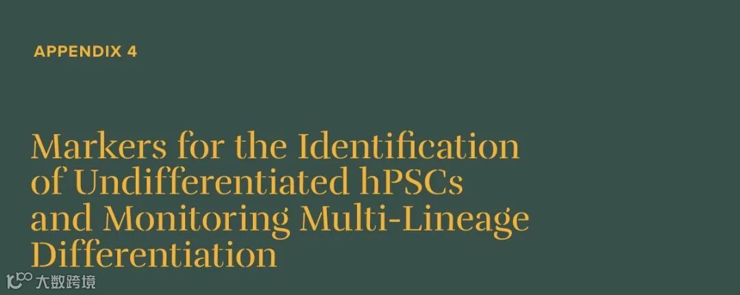 挂图中提到有关hPSC的多能性和未分化状态的鉴定,如测定方法、定量结果以及统计分析以及与关键实验相关的分析时间等内容,人类细胞的多能性应通过评估分化能力的实验来证明,通过定量测量外胚层、内胚层和中胚层的标志物组合的诱导情况,以及未分化状态标志物的缺失情况来验证分化能力。