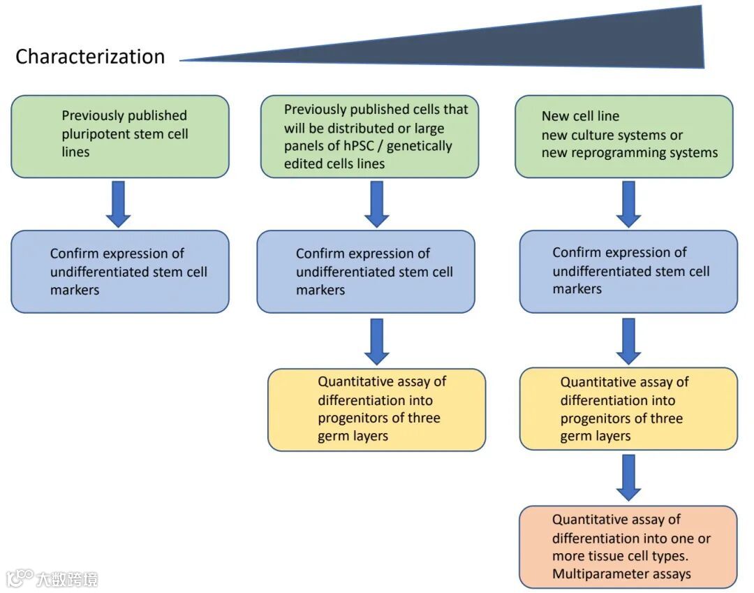 图2 hPSC细胞系的状态和研究目的影响其未分化状态以及多能性潜力的鉴定:以往发表的hPSC细胞系(左)比新细胞系或新培养或重编程系统(右)需要更少的鉴定步骤