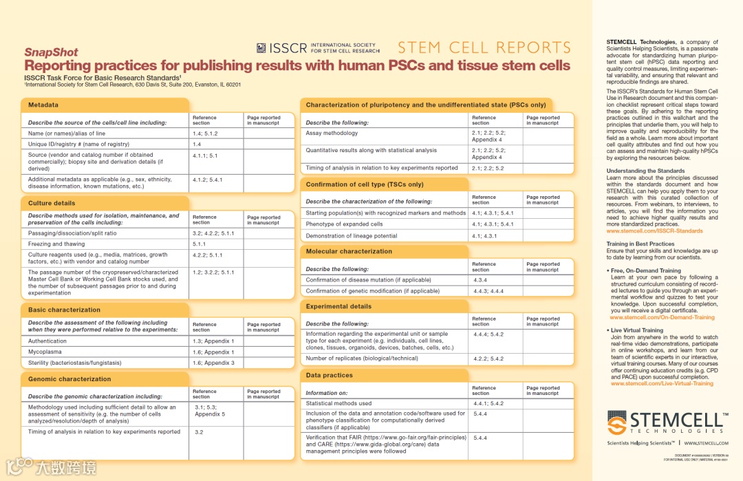 近期,Stem Cell Reports和ISSCR共同制作了一款挂图。挂图中清楚地罗列出人多能干细胞和组织干细胞成果发表的规范,并将其对应到指导原则中的不同章节,是研究过程中必不可少的参考资料。