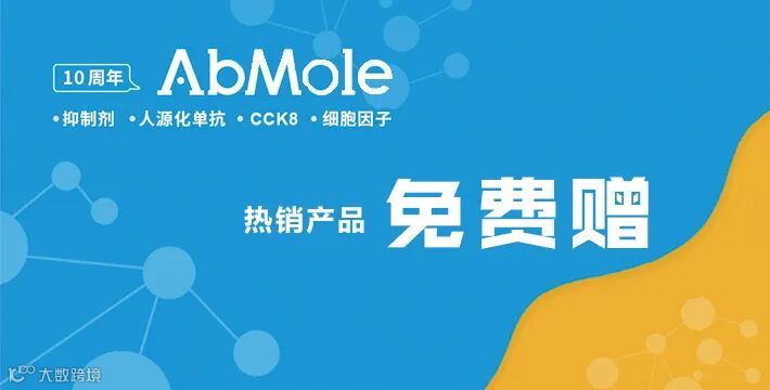 1. 朋友圈转发“AbMole十周年,热销抑制剂免费送”的文字及活动图片 或 将本次活动纸质宣传页拍照后发朋友圈并注明“AbMole十周年,热销抑制剂免费送”,集满8个赞后,截图连同常用邮箱、所在单位、姓名一并告知AbMole各地区授权经销商。即可获得上述产品的免费赠用装或精美时尚帆布袋一份。
