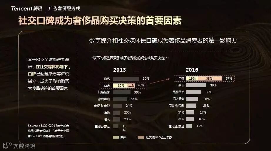 在社交媒体影响下,口碑已超越杂志等传统媒介,成为影响购买奢侈品决策的首要因素。