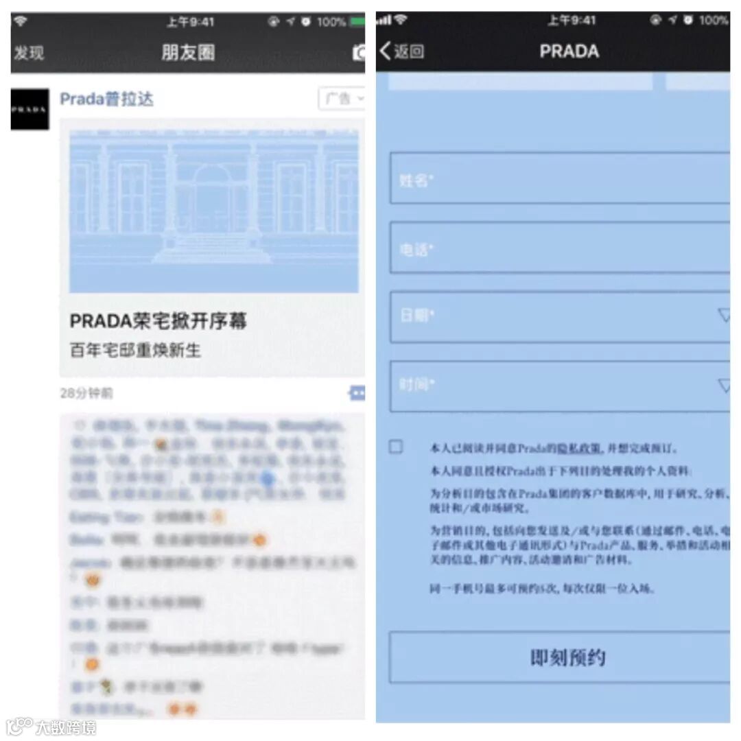 2017年10月17日,Prada上线了预约参观报名的小程序,意外地吸引了10万多人;原计划开放一个月至11月中旬,也在网友和市民的强烈要求下,特延期至12月17日。Prada破天荒地用起了小程序,这也成为它向年轻人靠近的开始。