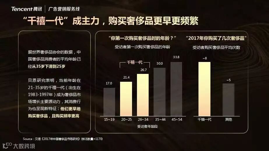 当前年龄在21岁至35岁的千禧一代(出生于1983年至1997年),成为奢侈品市场增长主要原动力,其消费行为也呈现新特征:更早地购买奢侈品,且购买频率更高。千禧一代2017年购买奢侈品的平均次数高达8次,而其他人群仅为5次,真正成为奢侈品行业消费“新贵”。