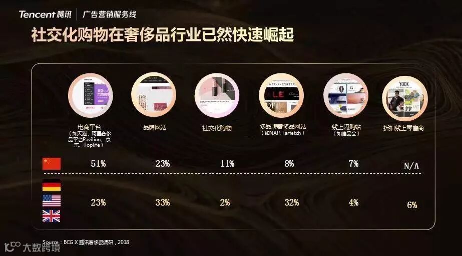 社交化购物呈现新的增长。社交化购物目前占中国在线奢侈品销售额的11%,远高于欧美国家2%的水平。