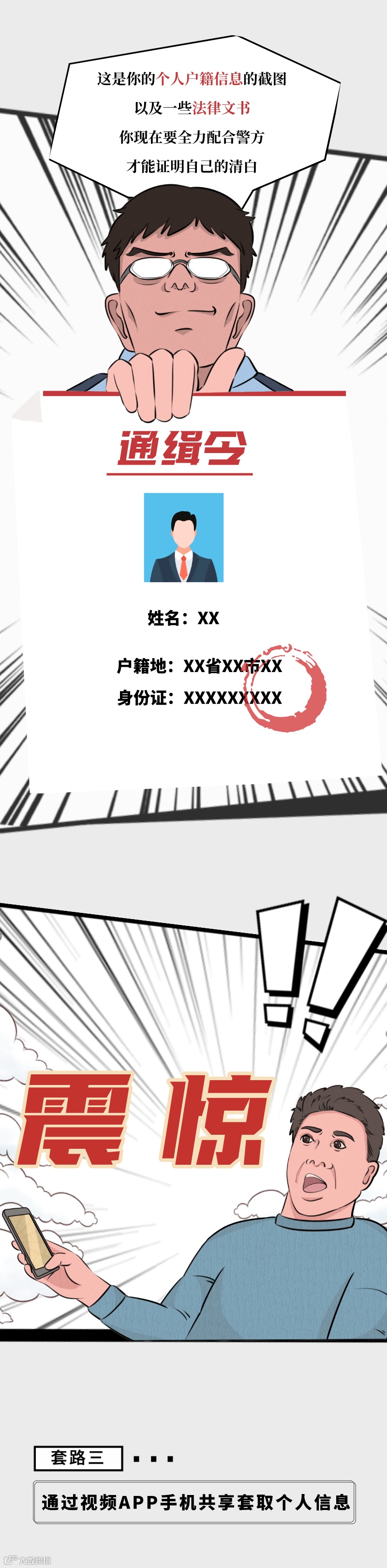 1. 凡是陌生来电主动转接电话至“公安机关”,通过网络出示“警官证、逮捕令”,要求做电话笔录的,都是诈骗!