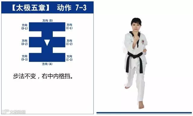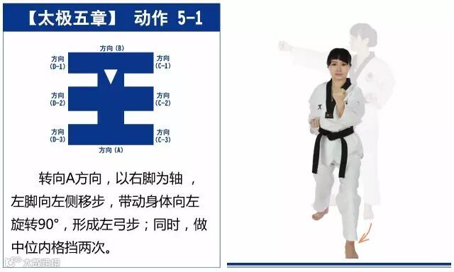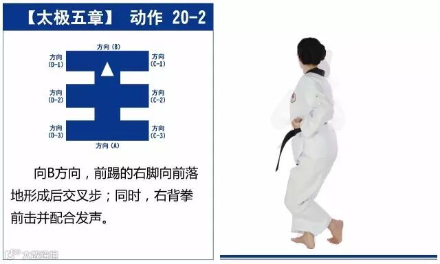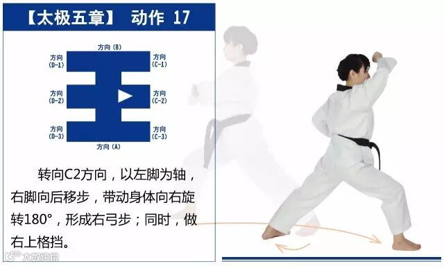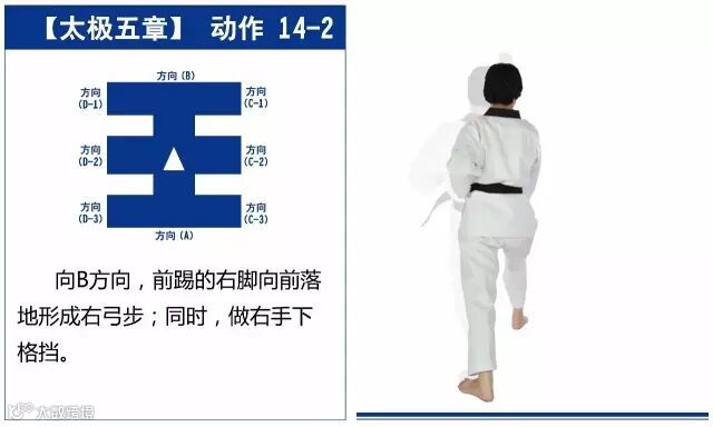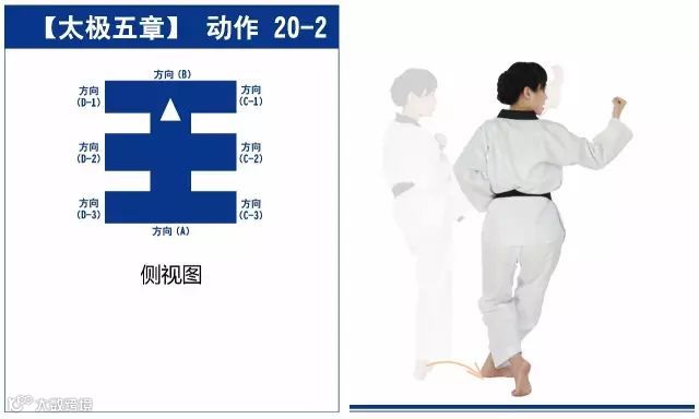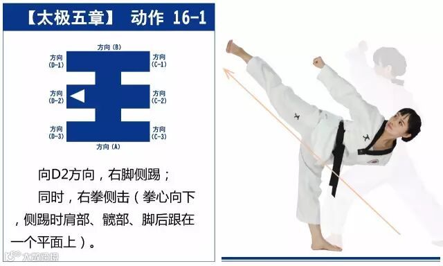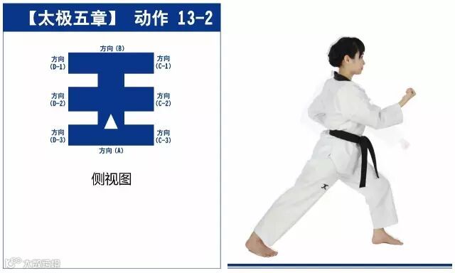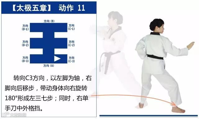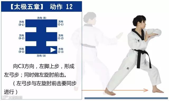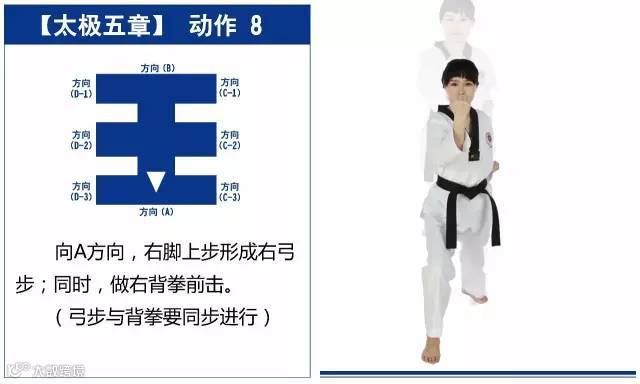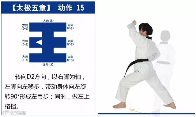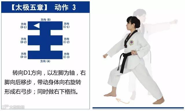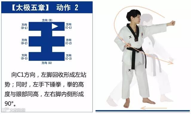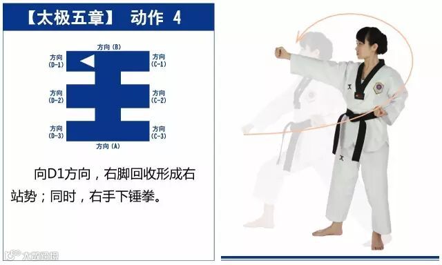 新的动作包括下锤拳、旋肘前击、侧踢的同时直拳侧击、掌肘对击。站姿是后交叉步和左右站姿。适合跆拳道4级修炼者练习。