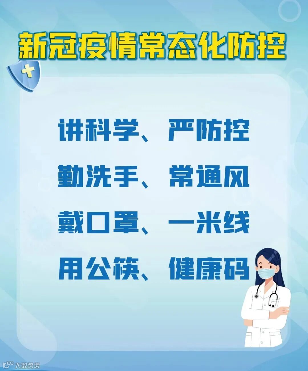 坚持“防疫三件套”:科学佩戴口罩、保持社交距离、注意个人卫生。共同筑牢疫情防控社会大防线!